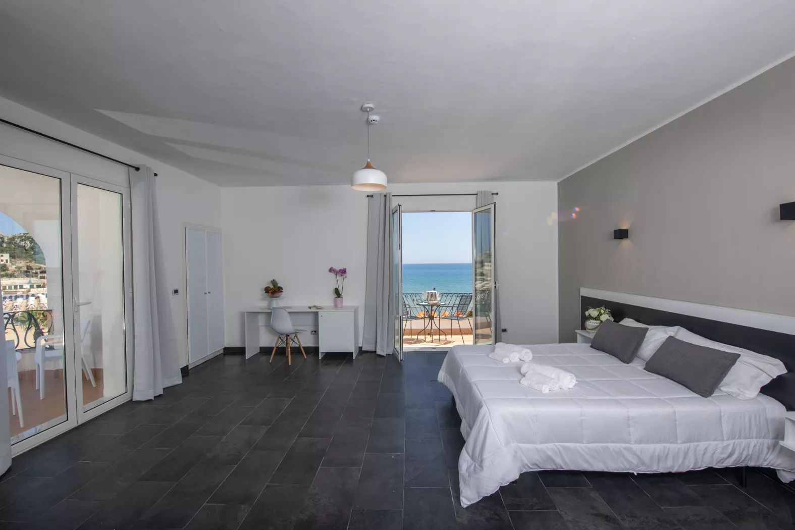 Le camere nel corpo principale, la maggior parte con terrazzo e vista mare, offrono panorami mozzafiato sull’azzurro del Mar Mediterraneo.